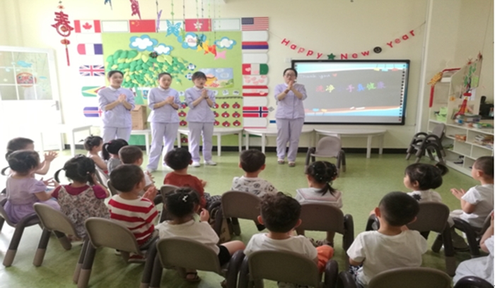 ??? 養(yǎng)成良好的手衛(wèi)生個人衛(wèi)生習慣是把住病從口入的第一關(guān)。6月14日,我院輸液室的護士來到柯城區(qū)裕豐國際幼兒園,開展了 “兒童手衛(wèi)生——手互健康” 的公益活動。