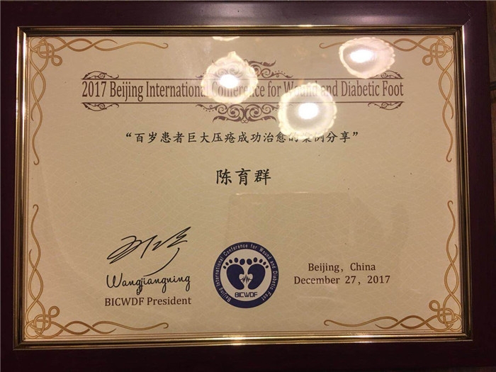 ??? 在認(rèn)真檢查、評(píng)估傷口后,陳育群收下了他住院,與外科醫(yī)生一起制定方案,采用新型濕性愈合換藥理念及功能性敷料,為詹師傅治療。奇跡發(fā)生了,一個(gè)多月以后,詹師傅痊愈了?,F(xiàn)在,他成了陳育群的“活廣告”,到哪都夸陳育群的技術(shù)好。
