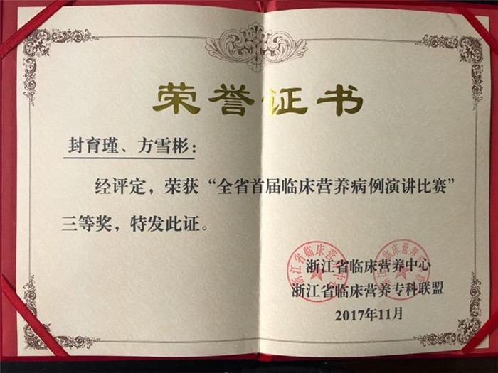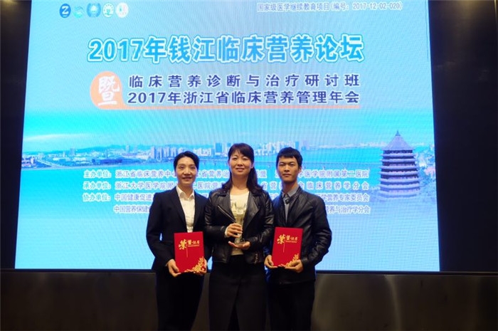 ??? 我院營養(yǎng)科方雪彬、封育瑾團(tuán)隊(duì)經(jīng)過初賽、決賽等挑戰(zhàn),憑著對營養(yǎng)工作的獨(dú)特見解及規(guī)范的營養(yǎng)治療原則,他們的《食管癌術(shù)后營養(yǎng)參與》病例分享在省內(nèi)多家醫(yī)院的21個(gè)團(tuán)隊(duì)中脫穎而出,獲得浙江省首屆臨床營養(yǎng)病例比賽三等獎(jiǎng)。