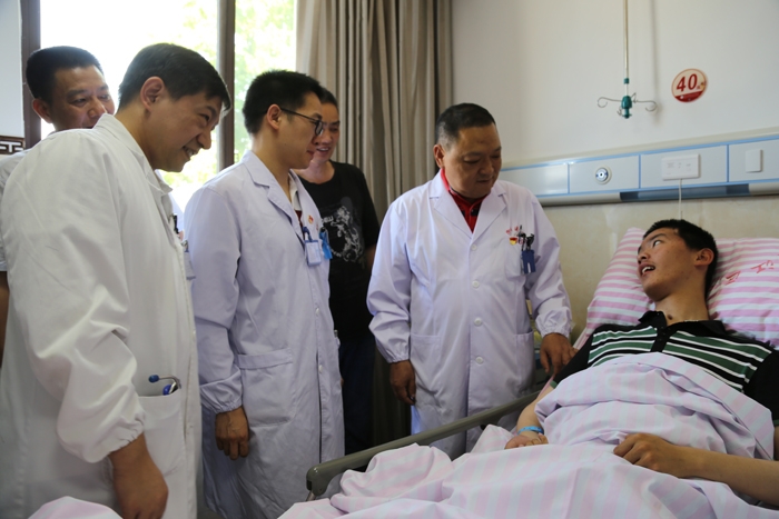 ??? 5月18日下午,衢州市衛(wèi)生計生委黨委委員、副調(diào)研員張??ьI(lǐng)由市人民醫(yī)院神經(jīng)外科、康復(fù)科及市第三醫(yī)院神經(jīng)內(nèi)科組成的醫(yī)療專家團(tuán)隊前往衢江區(qū)中醫(yī)院看望在此進(jìn)行康復(fù)治療的章浩杰同學(xué),市衛(wèi)生計生委黨委委員、市人民醫(yī)院黨委書記徐天才,市衛(wèi)計委醫(yī)政處處長劉文勇陪同前往。