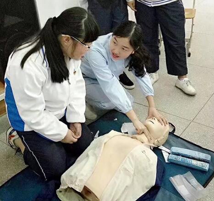 ??? 在進行了心肺復蘇的公開課后,為了讓同學們進一步掌握心肺復蘇術(shù),護士們開始了在模擬人身上的操作。