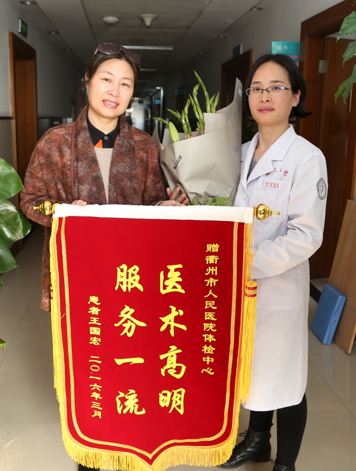 ??? “十分感謝趙醫(yī)生,是她的認真細致發(fā)現(xiàn)了我身上潛在的定時炸彈,讓我及時得到了治療……”3月1日下午,王女士捧著鮮花和錦旗來到衢州市人民醫(yī)院,專程來感謝曾為她診斷出疾病的B超室醫(yī)生趙中洪。