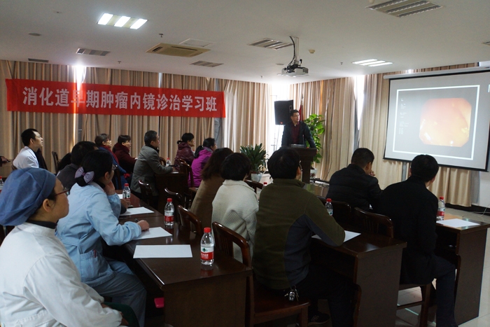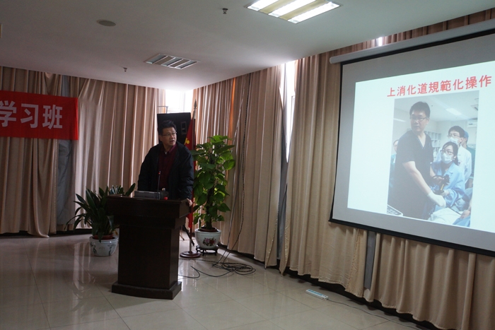 ??? 學(xué)習(xí)班上,我院副院長(zhǎng)王李華致歡迎詞。傅光義教授針對(duì)上消化道早癌內(nèi)鏡下診斷技巧做了專(zhuān)題講座,圖文并茂,生動(dòng)有趣。