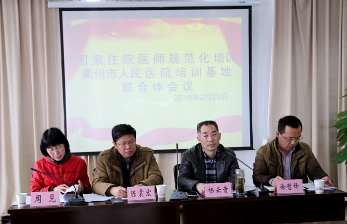 ??? 2月23日上午,國家住院醫(yī)師規(guī)范化培訓基地聯(lián)合體工作會議在我院順利召開,市衛(wèi)計委黨委副書記楊云貴、市醫(yī)學學術(shù)管理中心主任徐哲鋒、市人民醫(yī)院、市第三醫(yī)院、衢化醫(yī)院、江山我院、龍游縣人民醫(yī)院、常山縣人民醫(yī)院、開化縣人民醫(yī)院等七家醫(yī)院的分管院長,科教、財務(wù)等相關(guān)負責人,以及我院專業(yè)基地相關(guān)負責人參加了會議。會議由院黨委副書記周見主持。