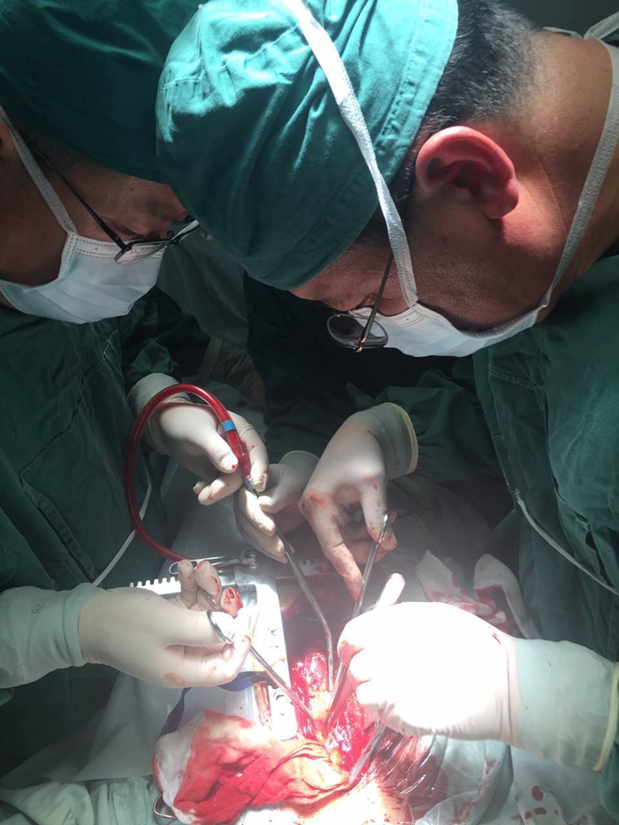 ??? 手術(shù)室里麻醉科醫(yī)生夏昌興、徐玲和手術(shù)護(hù)士汪美君、劉戀、董杰等醫(yī)護(hù)人員早已嚴(yán)陣以待,立刻建立大靜脈輸液通路、快速補(bǔ)液,麻醉誘導(dǎo)、氣管插管,備自體血液回收機(jī),交叉配血。同時(shí)邀請(qǐng)ICU王舜堯副主任做好體外循環(huán)準(zhǔn)備。心胸外科的朱海宏、郭勸民、邱燕軍醫(yī)生團(tuán)隊(duì)迅速開(kāi)胸探查,發(fā)現(xiàn)左側(cè)胸部第3肋間、鎖骨中線外側(cè)1.0cm處有一橫行創(chuàng)口,長(zhǎng)約3.0cm,該創(chuàng)口貫穿胸壁;心包膨隆、張力高,心包腔內(nèi)有300ml左右的新鮮血液及血塊,并可見(jiàn)左心室前外側(cè)壁有活動(dòng)性出血,可見(jiàn)破口約1.0cm,深約0.5cm,其對(duì)應(yīng)左前外側(cè)心包有1.5cm破口;左下肺下舌段約1.0cm貫通破口。醫(yī)生們?cè)诓粩嗵鴦?dòng)的心臟上完成心肌破裂傷口的縫合修補(bǔ),難度可想而知。