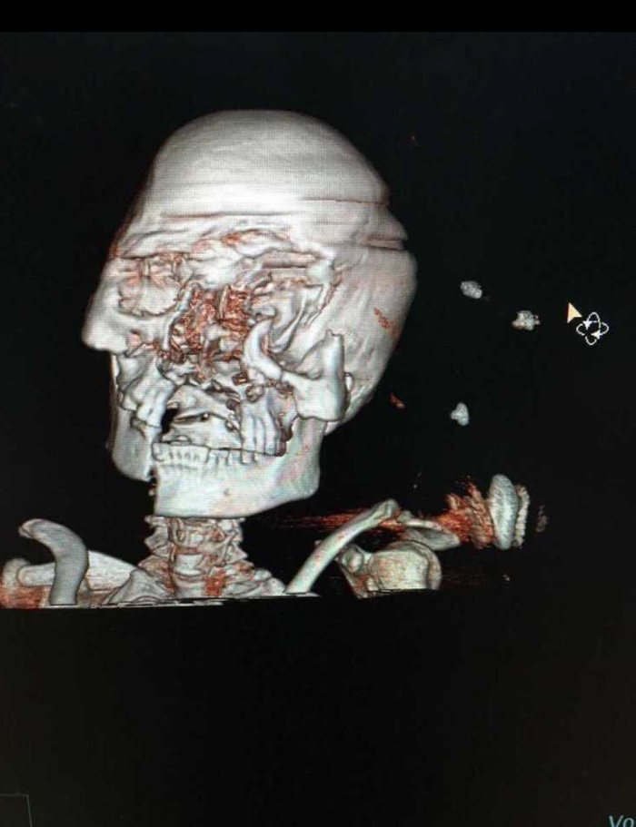 ??? 在當(dāng)?shù)蒯t(yī)院包扎止血后,22:25分朱女士被送抵衢州市人民醫(yī)院急診科。立即開通靜脈通路,輸血、補(bǔ)液擴(kuò)容抗休克,氣管插管,一切搶救有條不紊地進(jìn)行著。急診頭顱、顱底、頜面、頸椎、胸部CT平掃,提示前中顱底、兩側(cè)額骨、鼻骨、右側(cè)眼眶內(nèi)外側(cè)壁、左側(cè)眼眶各壁、右側(cè)額竇前壁、左側(cè)顴骨、枕骨、右側(cè)下頜骨多發(fā)骨折;左眼球移位;左側(cè)顳枕部少量硬膜下出血,氣顱…… 期間血壓進(jìn)行性下降至53/37mmHg,脈搏細(xì)速137次/分,意識(shí)轉(zhuǎn)入昏迷,瞳孔開始散大, 病情嚴(yán)重威脅著患者的生命。