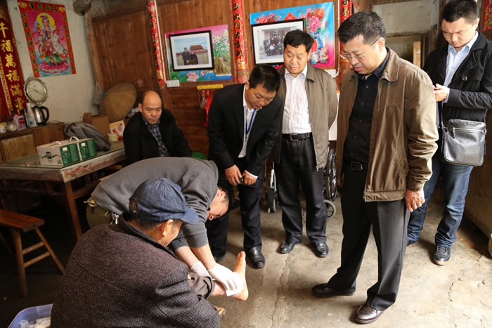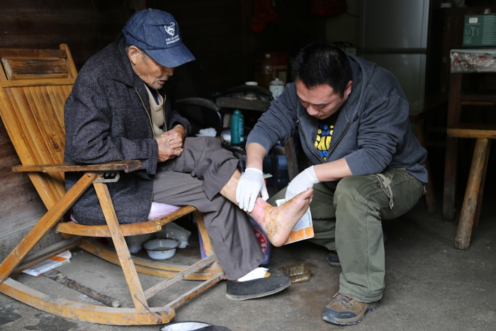??? 隨后,劉丙瑞一行帶領(lǐng)萬(wàn)少華總隊(duì)隊(duì)長(zhǎng)、我院普外科醫(yī)生金晶等醫(yī)護(hù)人員來(lái)到柯城九華鄉(xiāng)塢口村看望“爛腳病人”魏洪福老人。據(jù)悉,老人曾于2014年9月2日去北京解放軍307醫(yī)院治療(手術(shù)植皮),住院110天,不能完全愈合而出院。專家此次前來(lái),特地了解病人的恢復(fù)情況并作換藥指導(dǎo),在現(xiàn)場(chǎng),金晶重新將魏洪福的傷口進(jìn)行了清理、治療、包扎。專家們的認(rèn)真和親切,讓老人感動(dòng)不已。
