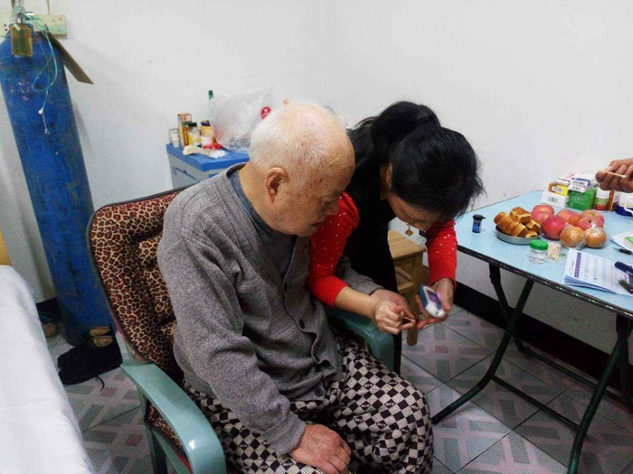 為趙大爺測量血糖,胡朝暉根據大爺的血糖情況,更改了胰島素的注射劑量,并交代了一些注意事項。