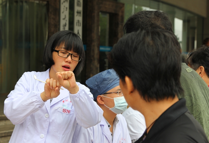 ??? 義診活動(dòng)吸引了很多市民駐足咨詢,口腔科的醫(yī)護(hù)人員認(rèn)真解答并宣傳齲病、牙周病的防治和義齒修復(fù)等口腔衛(wèi)生保健知識(shí);示范正確刷牙方法,詳細(xì)講解潔治術(shù)、活動(dòng)義齒的佩戴和清洗等相關(guān)知識(shí)。市民陳大爺表示:“這個(gè)活動(dòng)好,以前不懂,不知道牙也有這么多毛病?,F(xiàn)在知道了,以后要好好保護(hù)!”