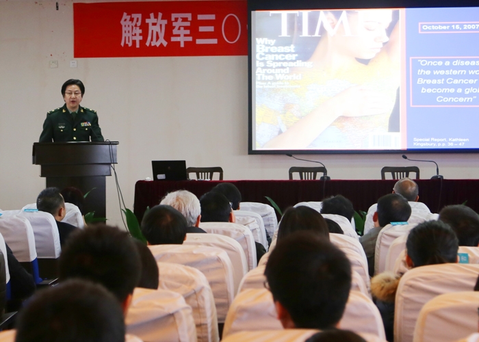 ??? 解放軍三〇七醫(yī)院是一所集醫(yī)療、科研、教學于一體的三級甲等醫(yī)院,是隸屬解放軍軍事醫(yī)學科學院的一個正師級單位。該院擁有全軍骨髓移植中心、腫瘤中心、中毒救治中心、放射病治療中心、采供血中心等五個全軍醫(yī)學??浦行模谀[瘤診療、化學毒物中毒急救、放射病治療、乳腺外科等領域?qū)?苾?yōu)勢突出。當天,解放軍三〇七醫(yī)院乳腺腫瘤專家江澤飛教授、肺部腫瘤專家高紅軍教授、血液病專家余長林教授、乳腺外科專家尉承澤教授還在我院進行了義診,短短的1個小時內(nèi)實地為近40名患者進行了會診。江澤飛教授、高紅軍教授還分別為全院醫(yī)護人員作了《科學決策人文服務》和《TKI耐藥治療策略》的專題講座。