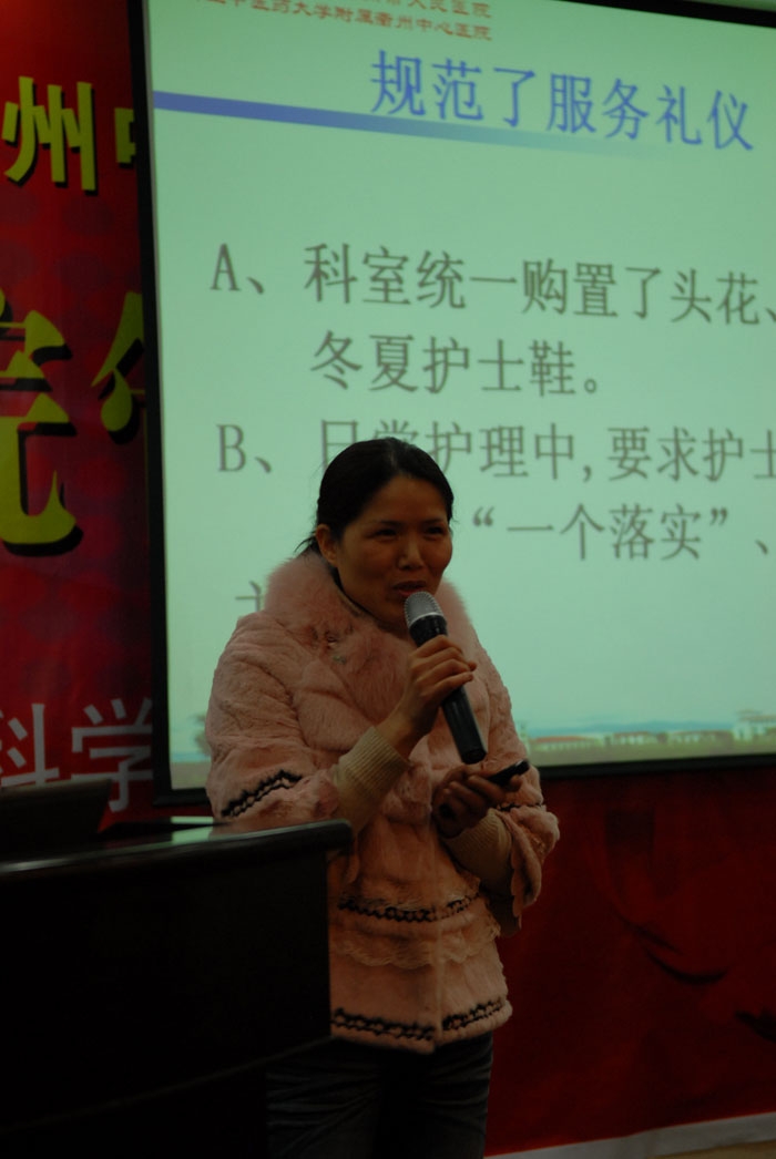本次講壇,10名來自護(hù)理崗位的護(hù)士登臺與在座的300余聽眾分享了各自科室開展優(yōu)質(zhì)護(hù)理活動(dòng)的經(jīng)驗(yàn)、心得、成果,就開展優(yōu)質(zhì)護(hù)理過程中遇到的困惑進(jìn)行了交流。與會(huì)的護(hù)士表示將再接再勵(lì),提高優(yōu)質(zhì)護(hù)理水平,達(dá)到“患者滿意、社會(huì)滿意、政府滿意”的目標(biāo)。
