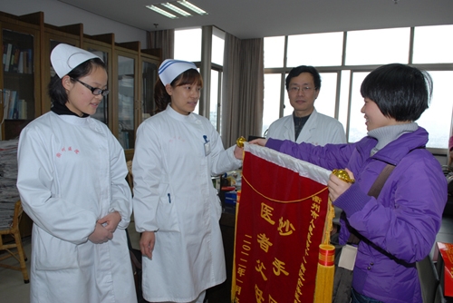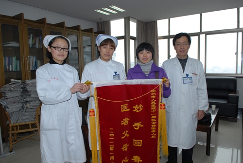 1月20日,市民汪女士特意來到我院為十一病區(qū)的醫(yī)護(hù)人員送上一面錦旗和一封感謝信。感謝主管醫(yī)生周一農(nóng)無私的愛心,高尚的醫(yī)德,精湛的技術(shù),及病區(qū)其他醫(yī)護(hù)人員的悉心照料,使她父親戰(zhàn)勝病魔,獲得了新生。