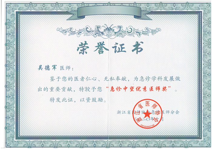 喜訊!我院急診科主任吳德軍榮獲浙江省“急診中堅優(yōu)秀醫(yī)師獎”