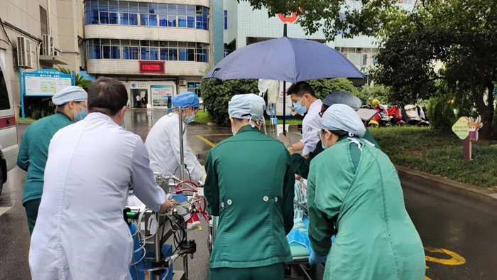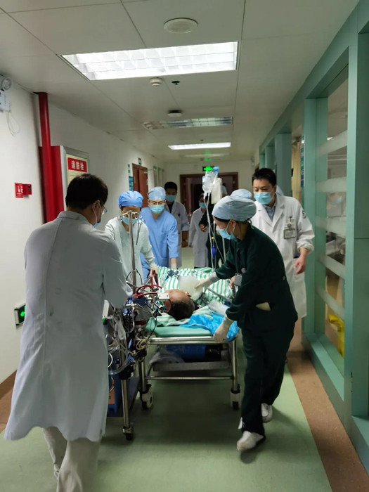時間一點一點在流逝,朱先生的生命也在流逝。醫(yī)院急救快速反應(yīng)體系急速啟動,急診科主任吳德軍、醫(yī)務(wù)處處長柴東劍、醫(yī)療副院長何冬娟第一時間趕到現(xiàn)場參與急救,溫州醫(yī)科大學(xué)急診醫(yī)學(xué)專家、醫(yī)院執(zhí)行院長李章平教授隨后趕到現(xiàn)場指揮,院內(nèi)多學(xué)科急救團(tuán)隊成立,在持續(xù)心肺復(fù)蘇的同時,即時超聲精準(zhǔn)評估心臟和容量狀態(tài),體外膜肺氧合(ECMO)團(tuán)隊快速行動,僅用13分鐘便成功在急診搶救室就地上機(jī)。在ECMO支持下,朱先生自主呼吸恢復(fù),血壓回升到80/60mmHg后被成功轉(zhuǎn)往重癥醫(yī)學(xué)科作后續(xù)治療。