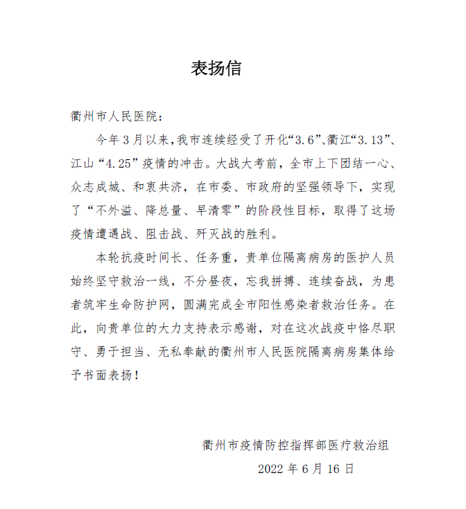 日前,我院收到了一封來自衢州市疫情防控指揮部醫(yī)療救治組的感謝信,為我院在此次疫情大考中忘我拼搏、主動擔(dān)當(dāng)?shù)木珰馍顸c贊。