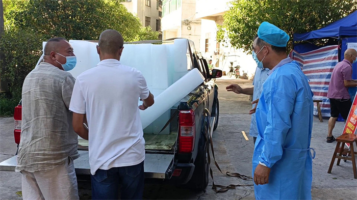 為了給采樣隊(duì)員降溫防暑,社區(qū)志愿者馬不停蹄地搬運(yùn)冰塊